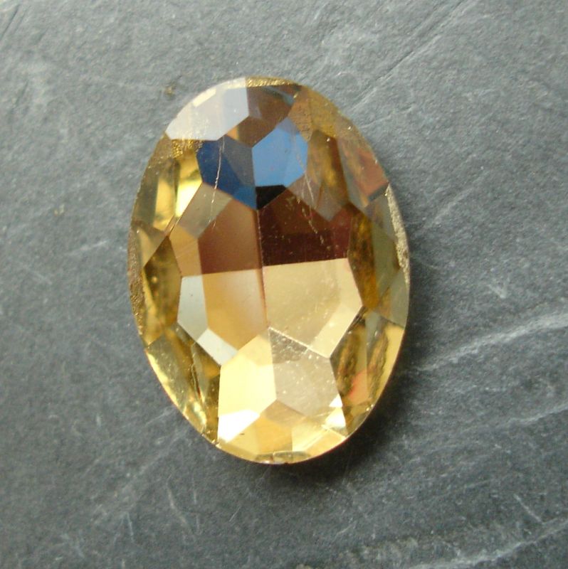 Skleněný broušený kamínek ve tvaru oválu ( bez dírky) o velikosti cca 18x13x5,5 mm. Zezadu pokovený pro vyšší lesk. Vhodný např. k obšívání.
